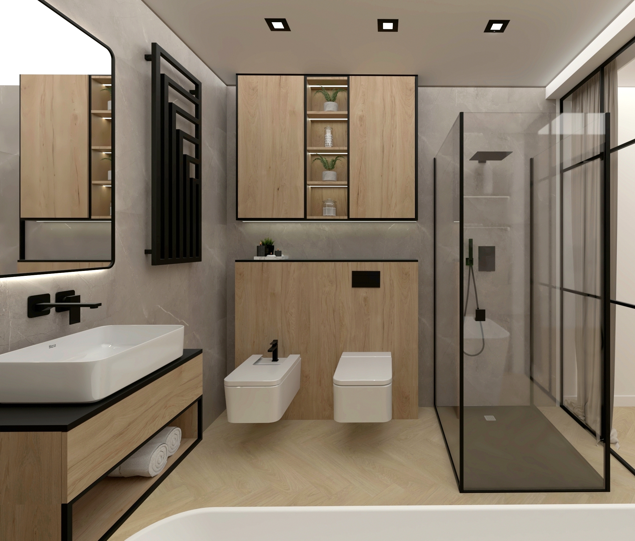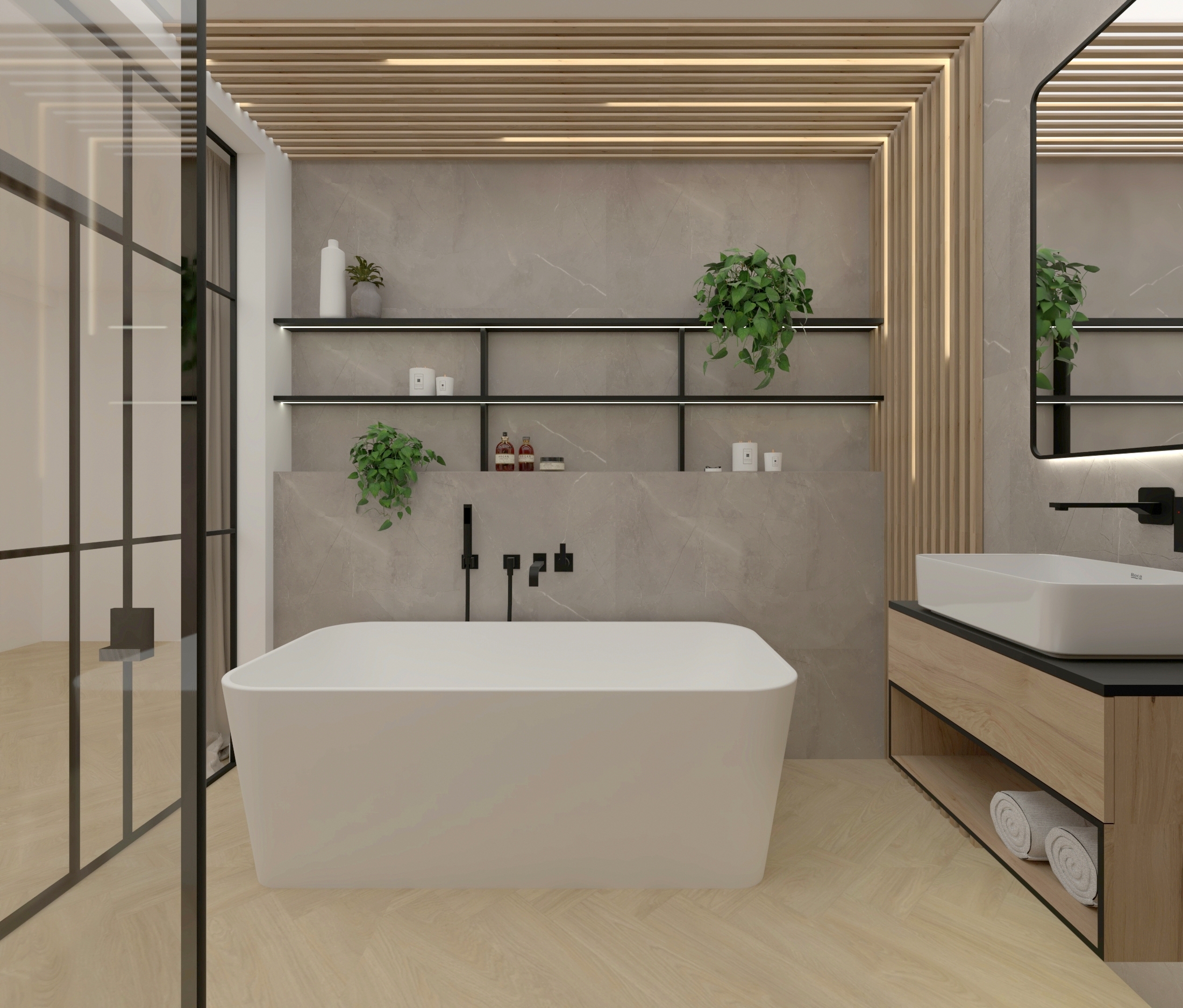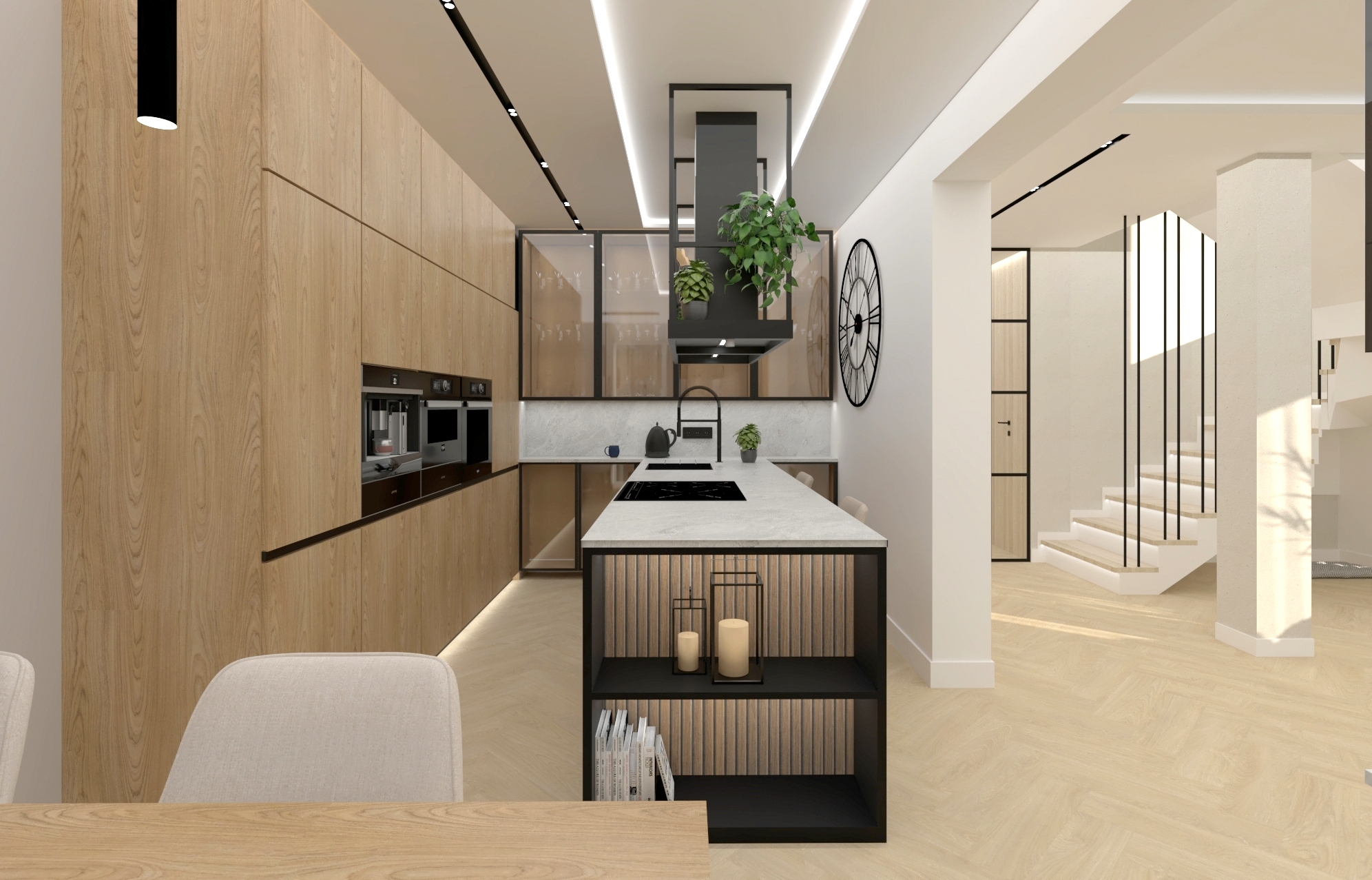 Bazą kolorystyczną jest kaszmir i złamane biele w połączeniu z naturalnym drewnem. Styl japandi widoczny jest w prostych formach i równowadze proporcji, natomiast subtelne elementy soft loft – czarne detale, przeszklenia oraz techniczne oświetlenie – wprowadzają nowoczesny akcent.