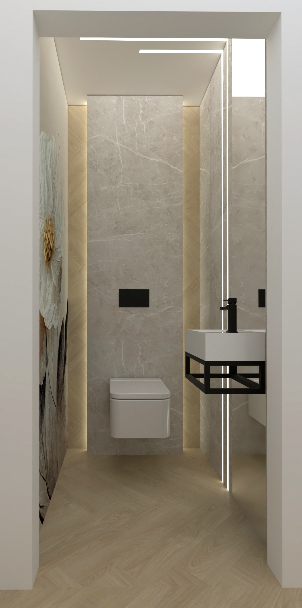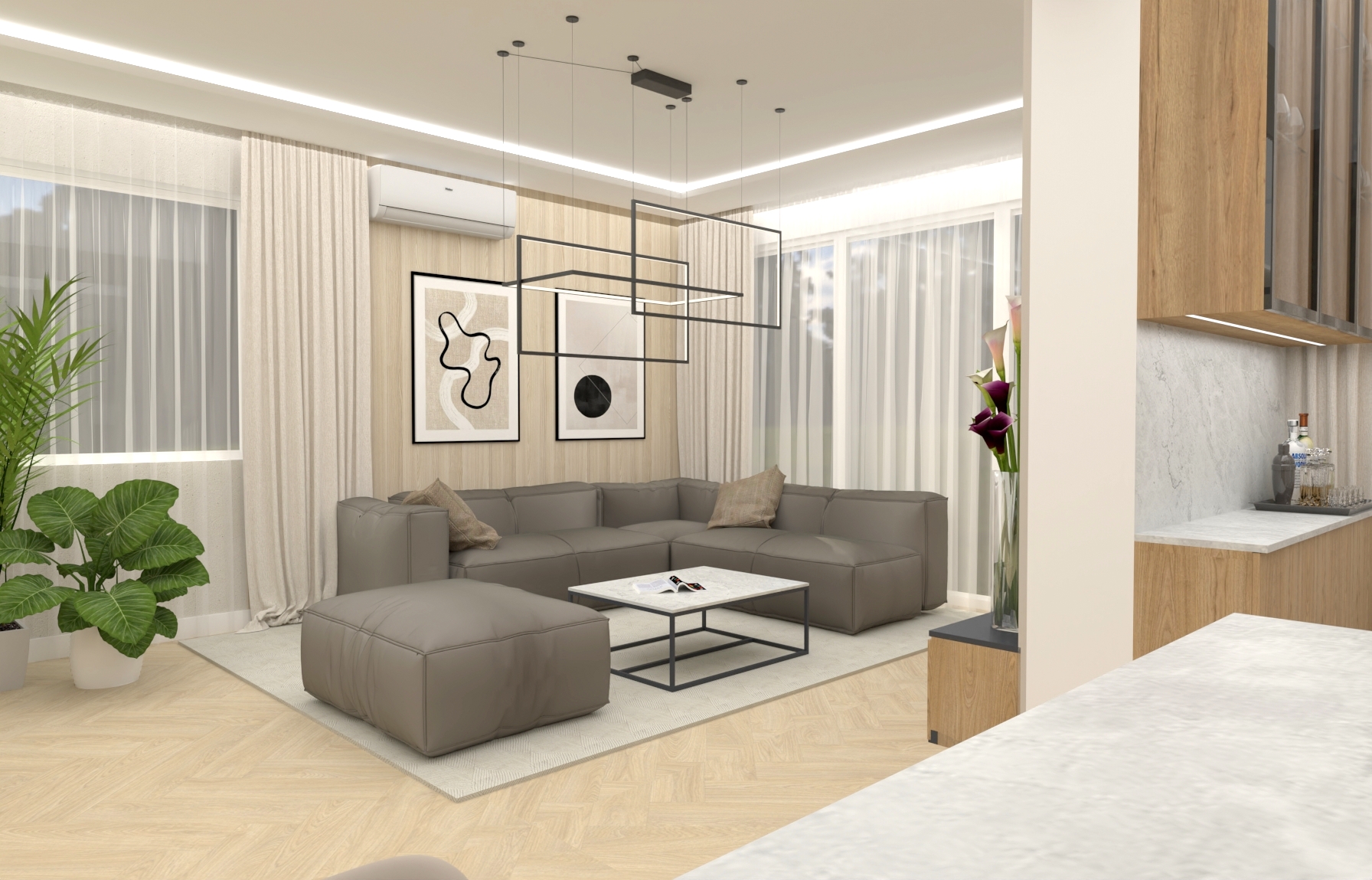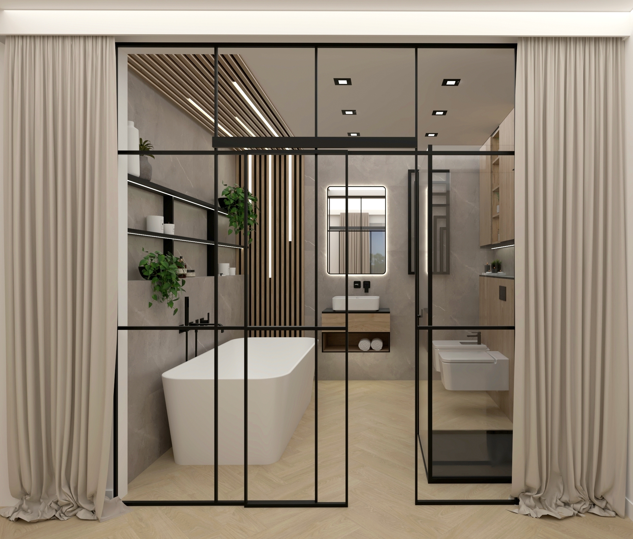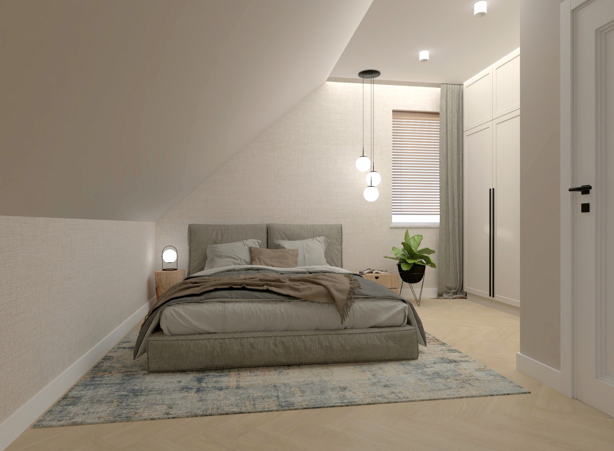 Bazą kolorystyczną jest kaszmir i złamane biele w połączeniu z naturalnym drewnem. Styl japandi widoczny jest w prostych formach i równowadze proporcji, natomiast subtelne elementy soft loft – czarne detale, przeszklenia oraz techniczne oświetlenie – wprowadzają nowoczesny akcent.