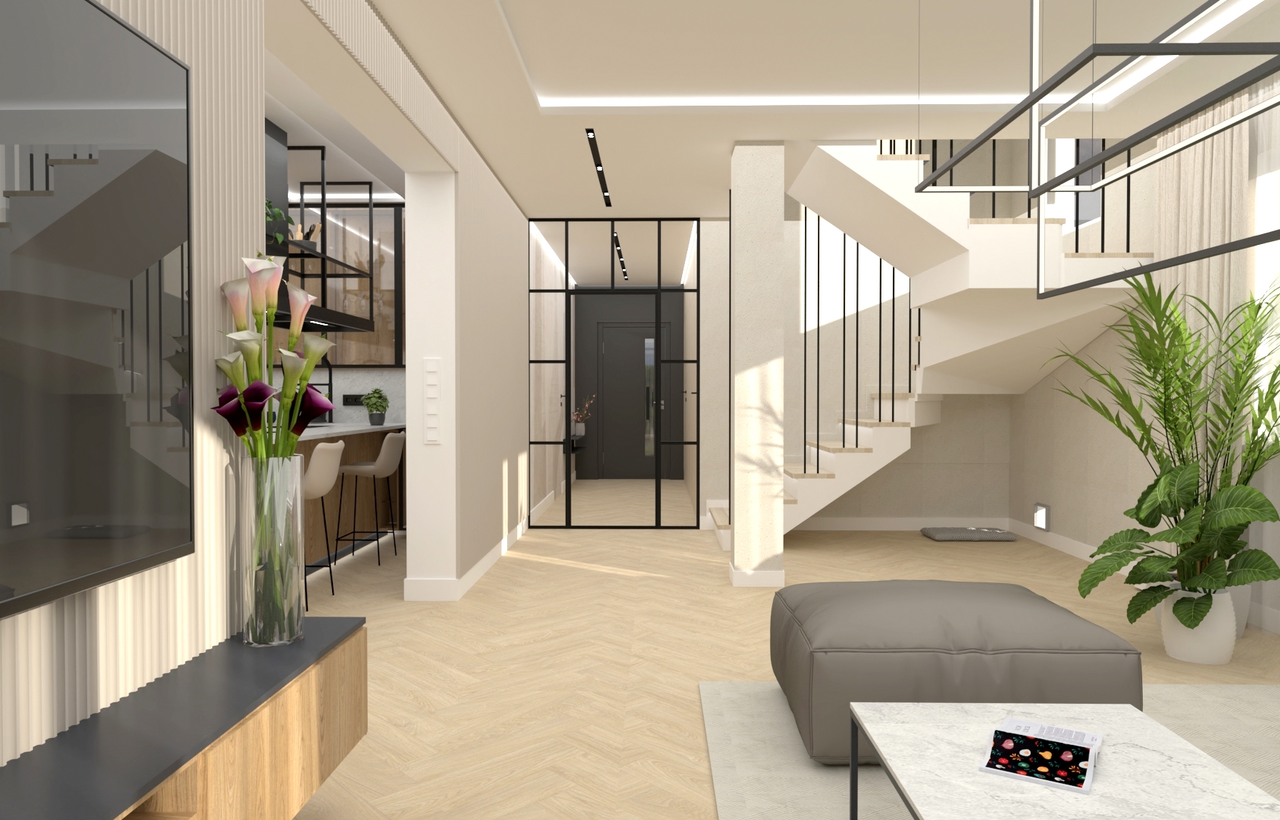 Motywem przewodnim jest jasna, ciepła jodełka ułożona w całym domu. Brak progów oraz jednolita podłoga porządkują przestrzeń i nadają jej elegancki, ponadczasowy charakter. To rozwiązanie nie tylko estetyczne, ale również wygodne w codziennym użytkowaniu.